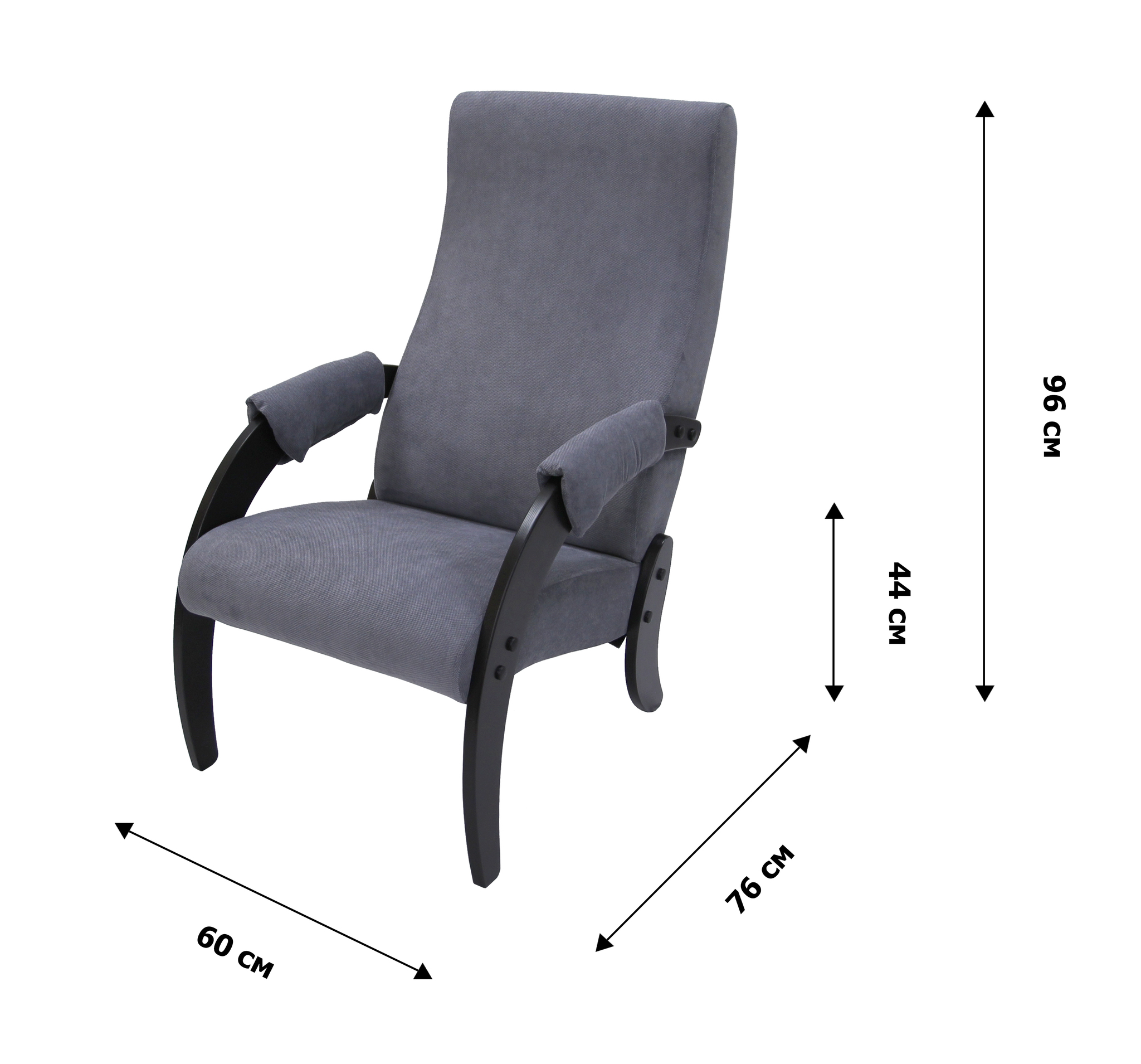 высота от пола до сиденья 44 см; угол наклона спинки 110-120-140, высота спинки от сиденья до верхней точки 71,8 см.